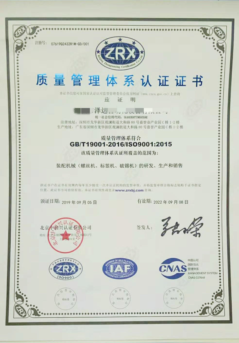 螺絲機專業(yè)生產廠家已通過ISO9001質量管理體系認證
